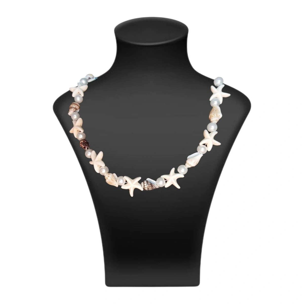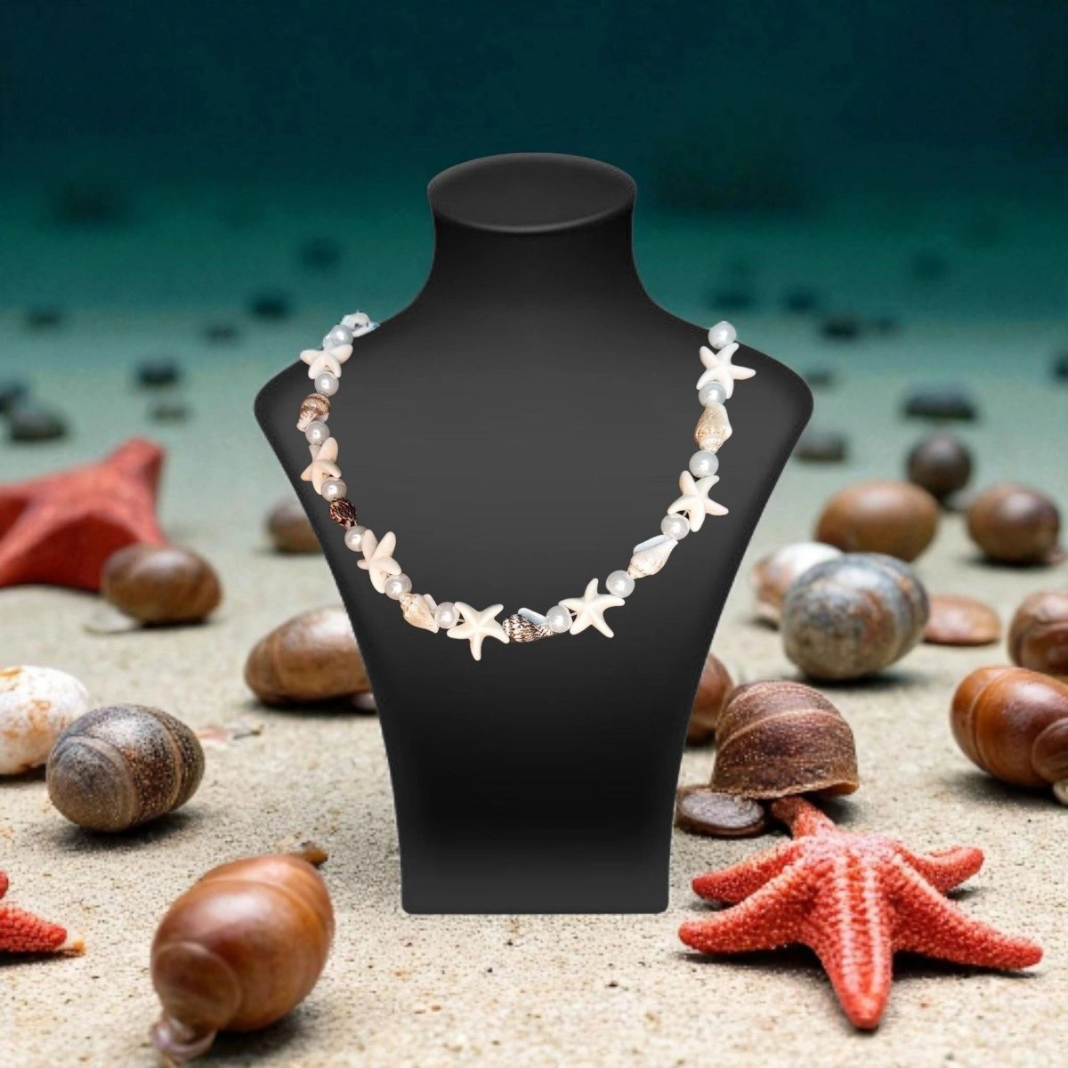 طراحی ظریف و منحصربهفرد این گردنبند باعث میشود به راحتی با استایلهای روزمره، ساحلی، کژوال و حتی مهمانیهای دوستانه هماهنگ شود. حضور مروارید در کنار صدف و ستاره دریایی، جلوهای خاص و متفاوت ایجاد کرده که استایل شما را شیکتر و جذابتر میسازد.